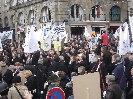 Partis de la mairie vers la préfecture, les manifestants dont un tiers en robes noires ont attendu le passage de la voiture de la Garde des Sceaux, Rachida Dati, avant de redescendre place du Parlement où les attendait comme d'ailleurs devant la préfecture, un cordon de CRS prêts à toutes éventualités. Les manifestants protestaient contre la réforme de la carte judiciaire. Les juristes de plusieurs TGI étaient venus de Morlaix, Guingamp et Dinan pour défendre leur tribunaux en passe d'être supprimés. Les syndicats FO et CFDT étaient aussi là pour protester contre la suppression de plusieurs prud'hommes et enfin les partisans de l'unité de la Bretagne étaient aussi venus pour s'assurer que l'unité judiciaire de la Bretagne qui comprend le tribunal de Nantes ne serait pas touchée (la région judiciaire bretonne est la dernière instance de la Bretagne historique à 5 départements). Certains défendaient tout cela à la fois et tout le monde semblait être d'accord pour conserver une justice de proximité ou du moins ne rien changer sans une concertation préalable — ce qui semble avoir fait défaut.