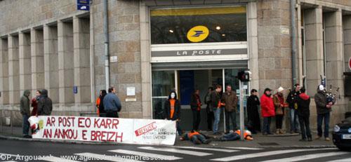 De jeunes militants concernés par le futur de la langue bretonne ont manifesté ce matin devant la poste centrale de Quimper qui vient d'être rénovée. Plusieurs militants s'étaient couchés sur le trottoir pendant que d'autres portaient des masques mortuaires ou distribuaient des tracts bilingues. Le tout symbolisant la mort du breton. L'Ankou avec sa faux était aussi sur les lieux. Ce serait une déception chez un grand nombre de Quimpérois puisque le bilinguisme n'y a pas été introduit comme l'espérait l'association Ai'ta (*) qui revendique cette action et demande le bilinguisme signalétique, que le breton soit introduit dans les automates comme les autres langues et qu'au minimum que les agents de la poste brittophones soient recensés et autorisés à parler breton aux clients. Des votations citoyennes devant des bureaux de poste auraient donné 95 % de résultats favorables à une présence du breton à la poste. Autrefois à l'école, les élèves qui parlaient breton étaient mis au coin avec un bonnet d'âne. La poste continue les brimades. Parlez breton au guichet et on vous demandera de circuler. Vous aurez plus de chance si vous parlez anglais car l'accueil des touristes étrangers y est certainement plus agréable. Pourquoi la Poste en pays breton ne serait-elle pas bilingue ? On s'imagine que favoriser les demandeurs d'emplois bilingues donnerait un bonus aux bretonnants et cela serait donc un encouragement à apprendre et à pratiquer la langue bretonne. Cela, on le sait depuis longtemps, l'État ne veut pas. On invoque la boîte de Pandore : le breton, puis le corse, puis l'alsacien et pourquoi pas l'arabe à Clichy ou à Marseille ? Et alors ? Et si cette unité tant recherchée n'était qu'un déni de réalité. Il ne s'agit là que de bilinguisme après tout. La Poste est depuis le 23 mars 2010 une société anonyme à capitaux publics. Donc aucune raison de suivre des directives du gouvernement comme le fait la SNCF. Si la Poste est devenue une société elle n'est plus tout à fait un service public et a parfaitement le droit d'introduire le breton dans ses bureaux comme l'a fait Super U dans certains de ses magasins, comme celui de Landudec où toute la signalétique des rayons est bilingue. Le privé encore une fois montre le chemin grâce à sa plus grande réactivité face aux attentes du public. Jusqu'à maintenant les services publics ont fait preuve d'autisme face aux requêtes d'organisations comme Ai'ta. ABP a essayé de joindre le directeur de la Poste de Quimper mais sans succès – surtout un samedi. Toutefois, Ai'ta aurait fini par obtenir un rendez-vous avec Guy Jeannin, directeur régional de La Poste à Rennes, mercredi prochain.(*) Ai'ta ! est un collectif distinct de tout groupe politique, qui lutte pour l'avancée de la langue bretonne dans la vie publique, et ce par des actions décalées et non-violentes. Philippe Argouarch