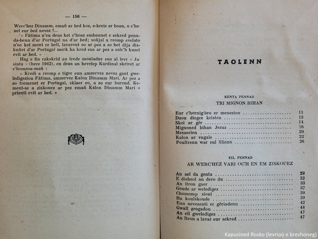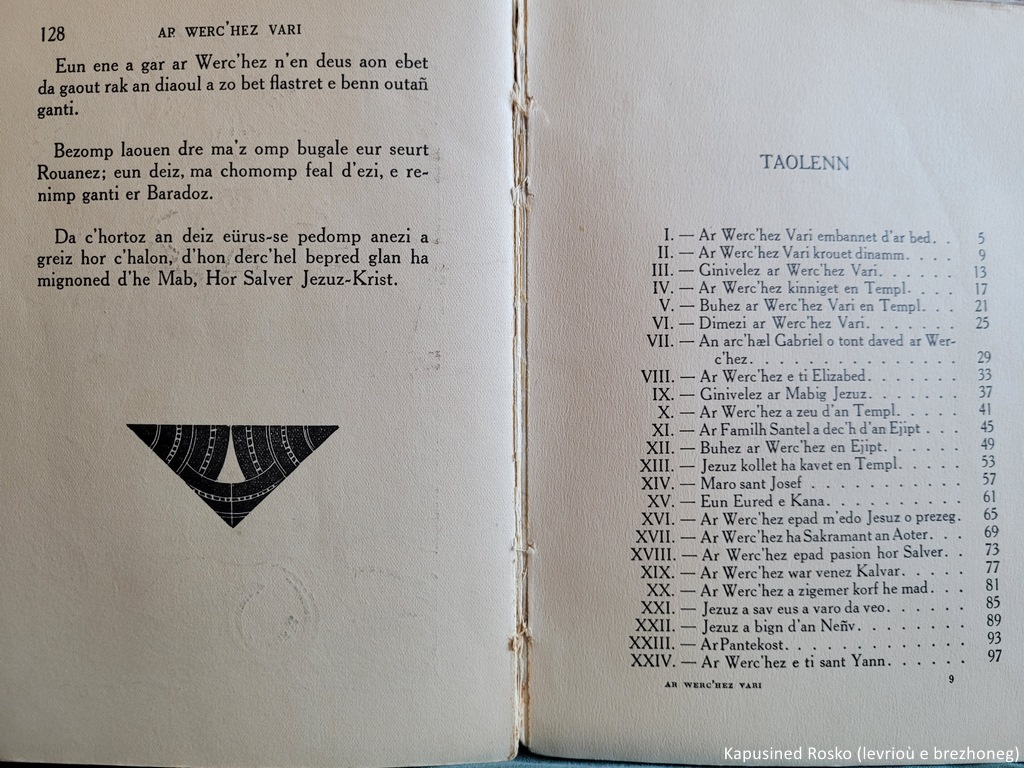 Marteze en em c’houlenno Yann Lenner e-unan petra soñjal a-zivout an danvez. Petra a oa lâret d‘an dud d’ar poent-se. Kemeromp skouerenn levr « Ar Werc’hez-Vari Hor Mamm » (gant Tad Medard).