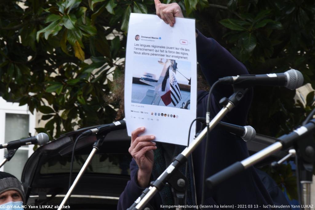 - Kemper manifestadeg, 13vet a viz Meurzh 2021. Un récent twitt du Président Emmanuel Macron: "Les langues régionales jouent leur rôle dans l'enracinement qui fait la force des régions. Nous allons pérenniser leur enseignement" . Justement, y a plus qu'à..! / N'eus nemet en ober, just a-walc'h!