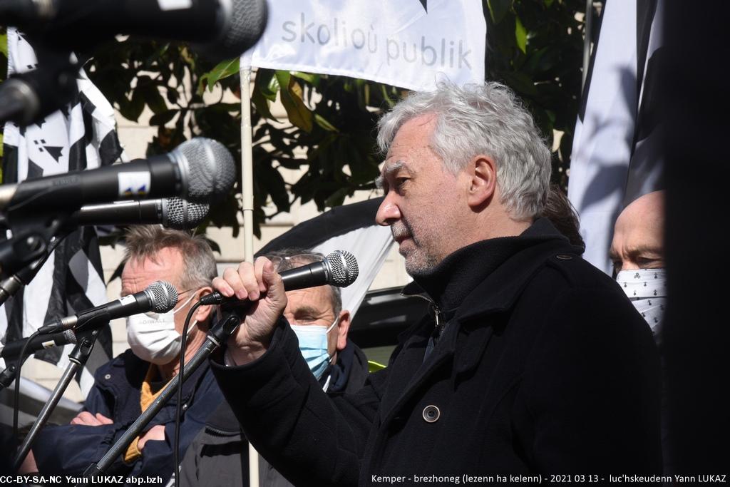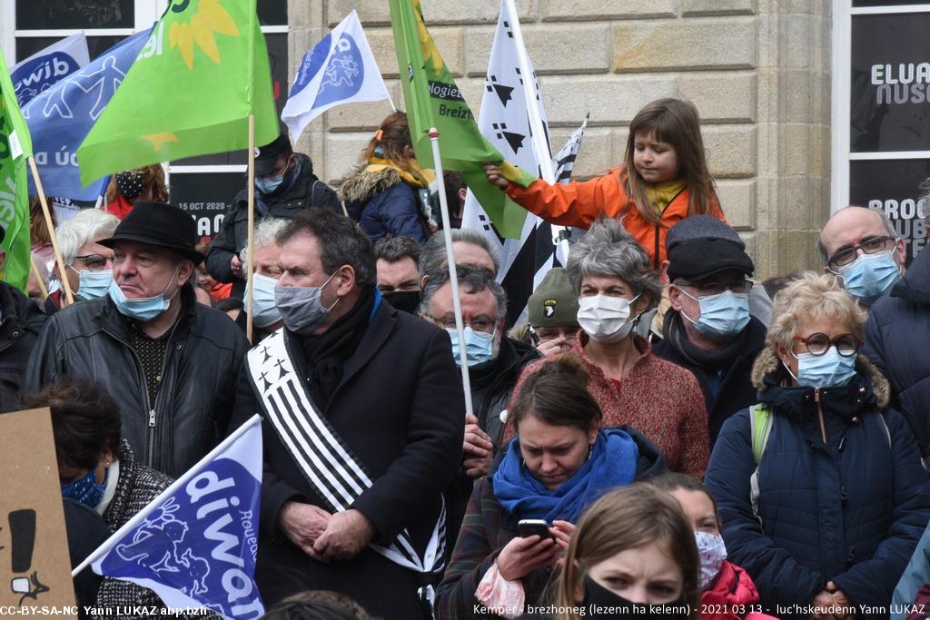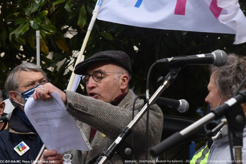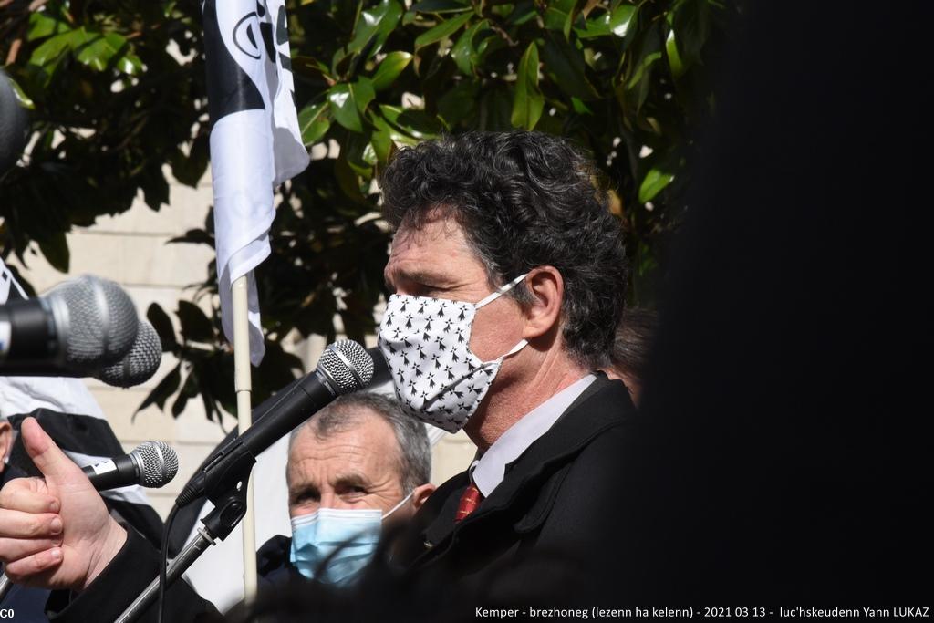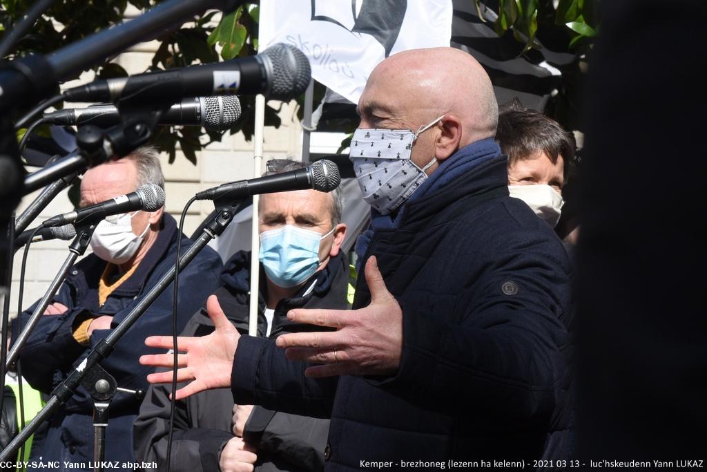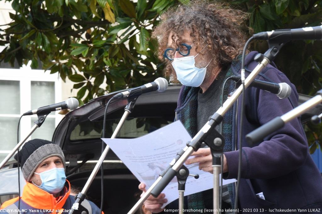 - Kemper manifestadeg, 13vet a viz Meurzh 2021. Kristian Troadeg, maer Karaez, gantañ ar skerb Breizh e livioù .