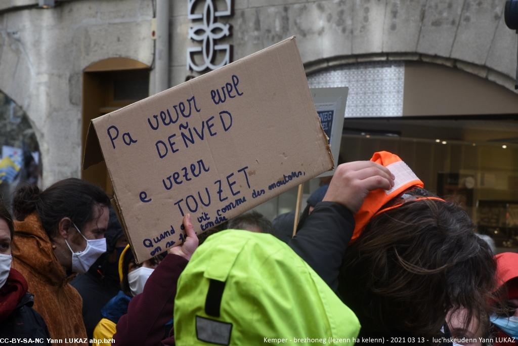 - Kemper manifestadeg, 13vet a viz Meurzh 2021. Skritell: "Pa vever evel deñved, e vezer touzet !" / Quand on vit comme des moutons, on est tondu! Trawalc'h! / Ca suffit!
