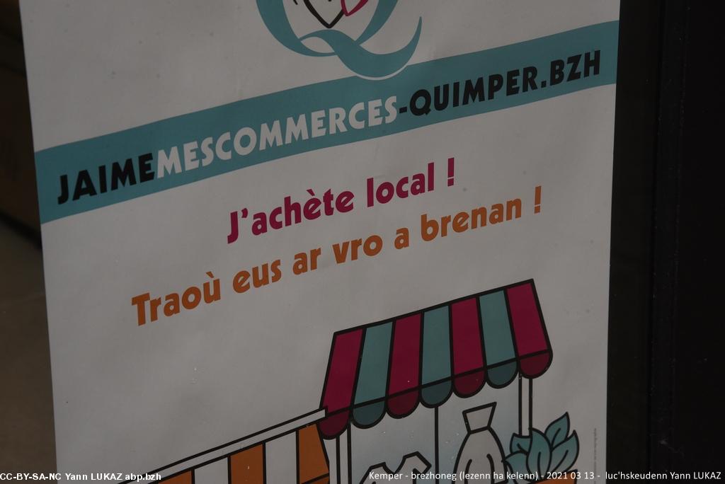 - Kemper manifestadeg, 13vet a viz Meurzh 2021. Affichette bilingue (jaimemescommerces-quimper.bzh): "Traoù eus ar vro a brenan!"