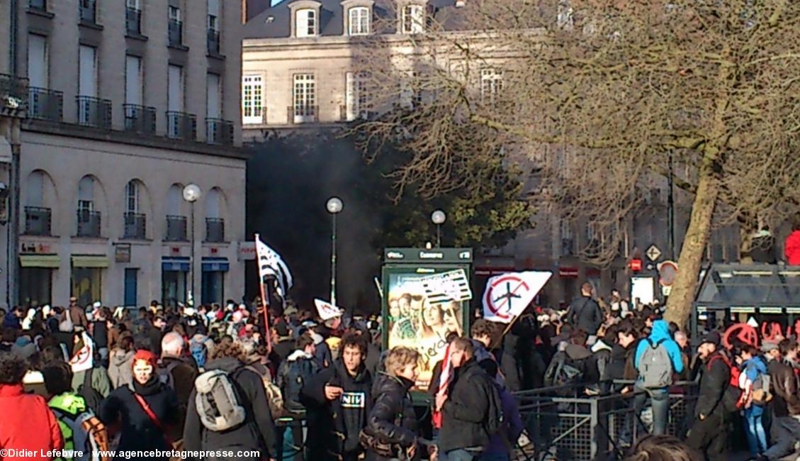 Pont-Morand, à l'angle de la Préfecture, lieu de départ du cortège. La foule s'amasse, bon enfant. Deux personnes arborent des bannières Anne de Bretagne. Interrogées, toutes les deux dédient cette manifestation à la Duchesse, nantaise et bretonne, en cette année symbolique du 500e anniversaire de sa disparition. Une centaine de Bonnets rouges, jusque là éparpillés, se regroupent pour manifester ensemble (et être vus). Premiers émois : " trois de nous ont été contrôlés en ville tout à l'heure ". Allons, messieurs, ne cédez pas à la paranoïa. À peine ces mots cités, les CRS en place non loin font mine de se rapprocher !!!Un semblant de charge qui échauffe la foule