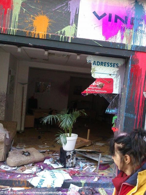 Le cortège passe devant l'Hôtel de Ville (entrée du public). Les barbouilleurs s'en donnent à c½ur joie. Sitôt après, un bureau de vente d'un promoteur pour plusieurs programmes immobiliers à Nantes. Pas de chance, il s'agit de Vinci, bénéficiaire du partenariat public privé pour l'aéroport. Bureau saccagé. La foule est toute bien remontée. Personne ne critique cette action. 50.000 coupables ?Des casseurs dans les manifestants, mais pas en marge