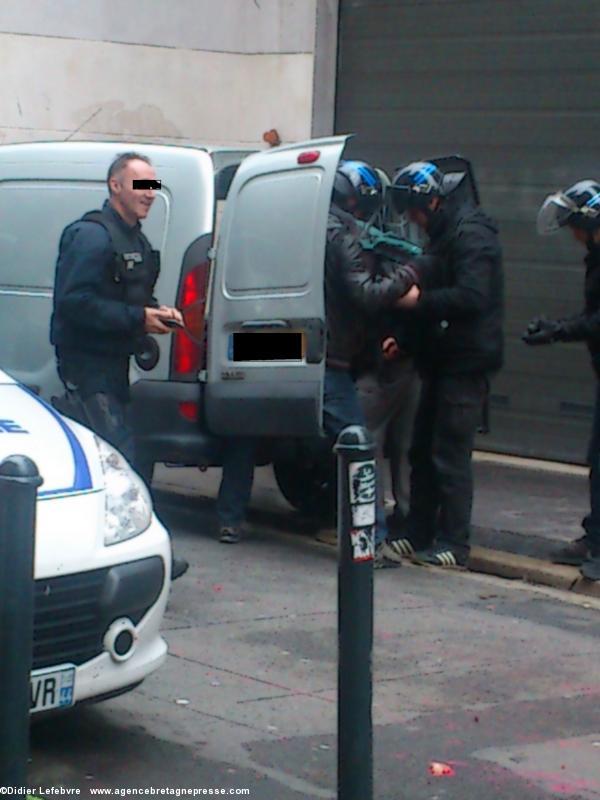 Fin de matinée, l'ambiance est plutôt tendue dans le centre de Nantes. Les CRS et les gendarmes mobiles se positionnent, par centaines. La manifestation organisée par la collectif « février 2015 » rassemble peu. Postés près d'une ruelle non loin du commissariat cours Olivier de Clisson, celui-là même qui avait été la cible de manifestants il y a juste un an [Lire], nous observons des dizaines de CRS préparant leurs flash-ball, une dizaine, en civil, vérifiant le contenu de leurs sacs à dos, et nous constatons un étrange ballet vers une fourgonnette banalisée (voir photo, hélas, d'autres photos plus explicites prises à la dérobée sont trop floues). Bref, la police se prépare.Des manifestants déterminés