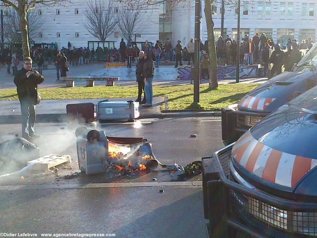 Elle sait que les manifestants contre les violences policières sont déterminés, et elle a raison. Sous les slogans de « policiers assassins », ils sont environ 2 000 à défiler. Il ne s'agit vraiment plus de la manifestation qui commençait bon enfant le 22 février 2014 contre le nouvel aéroport de Notre-Dame-des-Landes. Non, il s'agit bien d'une manifestation contre les violences policières. Les participants, du coup, ne sont pas les mêmes. Pas ou peu d'écologistes, quelques bonnets rouges, partis très rapidement, sentant que ce n'était pas une manif pour eux, pas de gwenn ha du. La moyenne d'âge est jeune. Très jeune.Des policiers comme des gendarmes : mobiles A la fin d'un premier circuit, passant près de la Préfecture, le groupe de manifestants se retrouve une première fois non loin de l'hôpital, et harcèle les forces de l'ordre. Celles-ci répliquent par des canons à eau et quelques charges. La manifestation, de plus en plus légère, fait un autre petit circuit sur les quais et revient vers l'hôpital. Selon le cheminement des manifestants (alors environ 200), les forces de l'ordre très mobiles se déplacent via des rues adjacentes, par dizaines de cars. On observe alors un étrange jeu, de mouvements et de pauses, où il y a toujours des heurts. La police aurait deux blessés légers (de nombreux cailloux volaient). Rapidement, on comprend bien la tactique policière, consistant à bloquer les manifestants le long de l'hôpital, en leur laissant une issue, vers le double pont du général Audibert. Ainsi, ils se retrouvent progressivement repoussés vers l'Île de Nantes, où les échauffourées s'arrêteront, les derniers manifestants se dispersant.