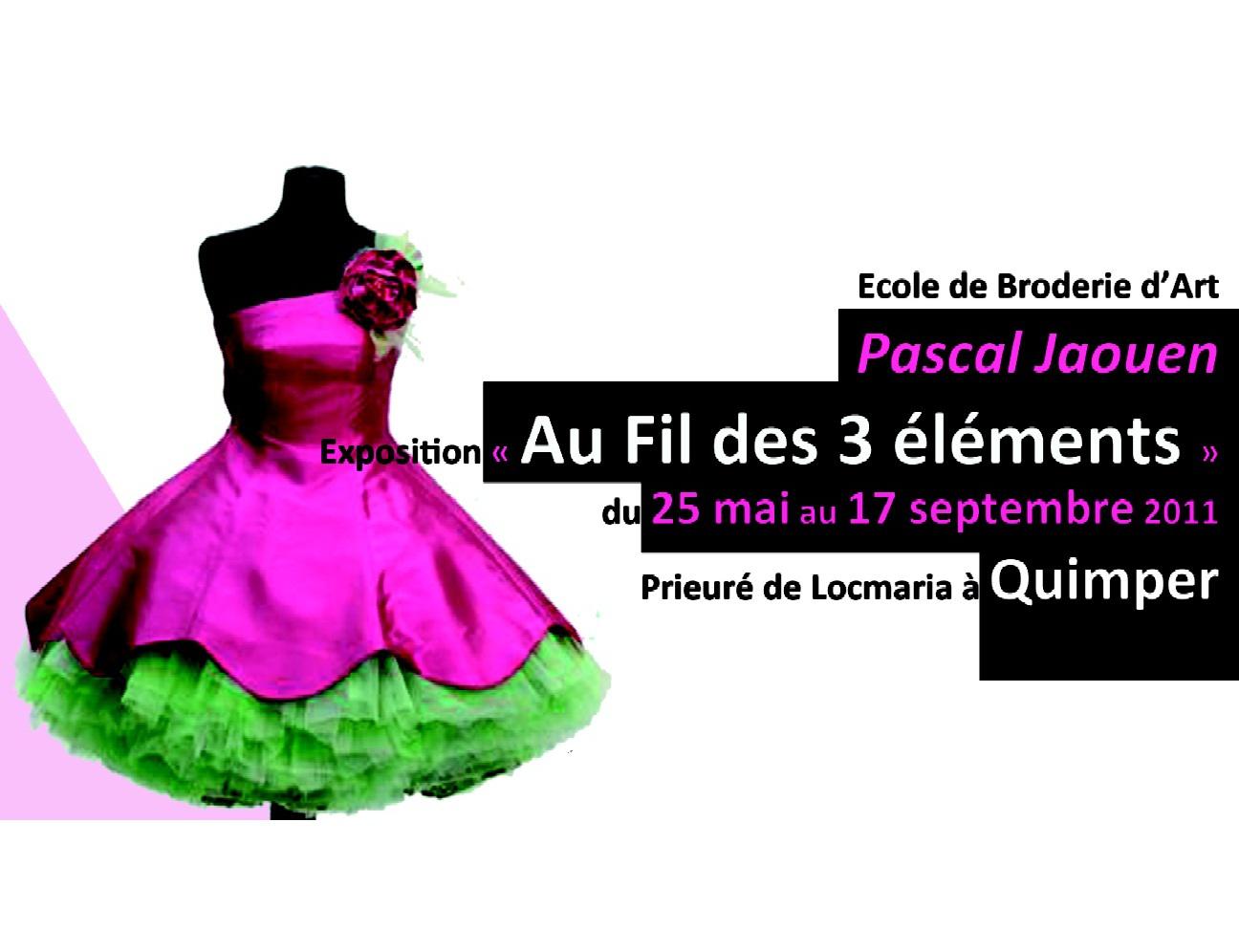 L'exposition "Au Fil des 3 Éléments" se poursuit jusqu'au 17 septembre. Elle a déjà accueilli 10.000 visiteurs. Elle met en scène 65 des modèles de sa dernière collection sur le thème de prédilection de Pascal Jaouen, le triskell : la terre, l'eau et le feu. L'exposition est ouverte de 13 h à 19 h sauf le lundi. À partir du 1er septembre de 13 h à 18 h du mardi au samedi. Prieuré de Locmaria, Kemper Entrée : 5 € Renseignements : 02 98 95 23 66 et de l’École de broderie. Elle se terminera par un défilé le 17 septembre. Voir PDFSur France 2 avec Nolwenn Leroy