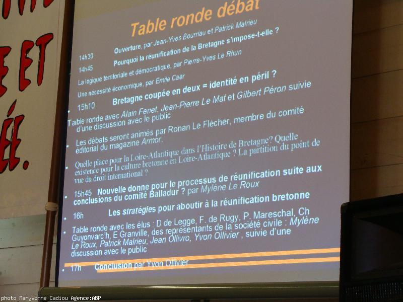 Jean-Yves Bourriau, président de Bretagne Réunie, Émile Caër, cadre d'entreprise (ER) et membre de l'Institut de Locarn, Alain Fénet, professeur (ER), Faculté de Droit de Nantes ; Émile Granville, maire-adjoint de Redon, porte-parole du Parti Breton ; Christian Guyonvarc'h, vice-président du Conseil régional de Bretagne (UDB) ; Jean-Pierre Le Mat, auteur d'ouvrages sur l'Histoire de Bretagne ; Pierre-Yves Le Rhun, géographe (ER), Institut de Géographie, Université de Nantes ; Dominique de Legge, conseiller régional de Bretagne et sénateur d'Ille-et-Vilaine (UMP) ; Mylène Le Roux, maître de Conférences, Faculté de Droit de Nantes ; Patrick Malrieu, ancien président du Conseil culturel de Bretagne ; Patrick Mareschal, président du Conseil général de Loire-Atlantique (PS) ; Yvon Ollivier, juriste, Coordination des Juristes de Bretagne ; Jean Ollivro, président de Bretagne Prospective, géographe, professeur, Université de Rennes ; Gilbert Péron, vice-président de l'Agence Culturelle Bretonne de Nantes ; François de Rugy, député de Loire-Atlantique (Les Verts) ont donné leur point de vue sur la stratégie à suivre pour une réunification de la Bretagne sans douleur. Les débats étaient animés par Ronan Le Flécher, membre du comité éditorial du magazine Armor. En fin de journée, Patrick Mareschal, président du Conseil général de la Loire-Atlantique a proposé une session commune du Conseil régional de Bretagne et du Conseil général de Loire Atlantique. Voir la vidéo du débat sur ABP-TV