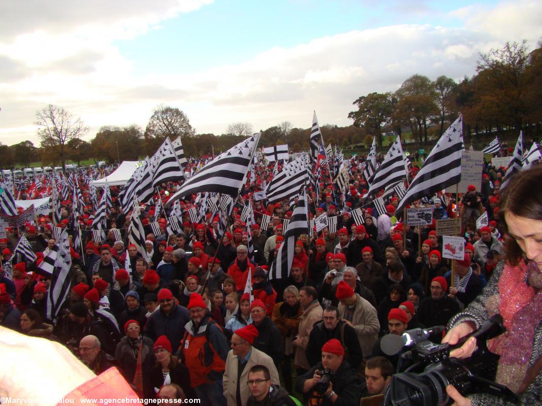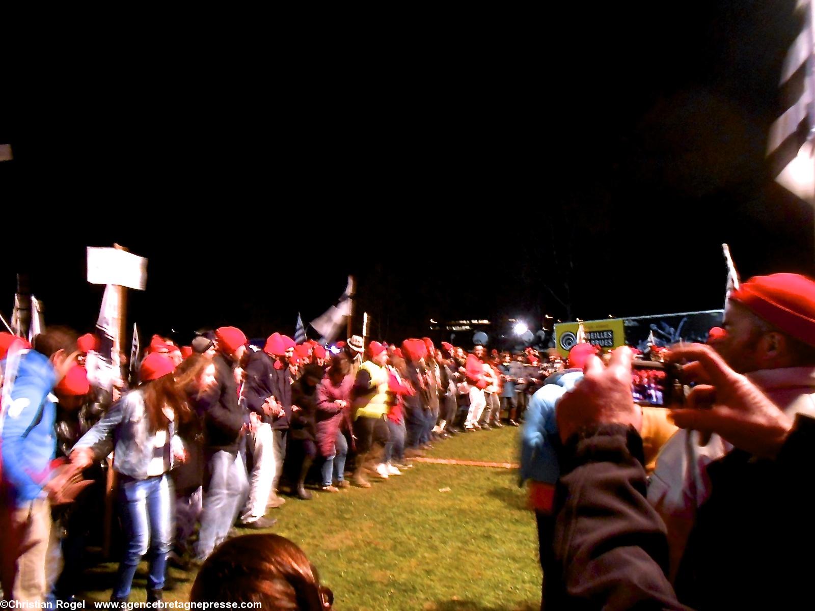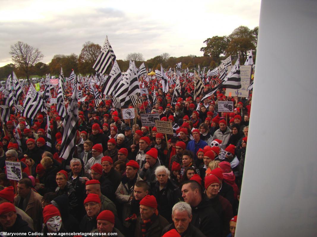 C'est entre 25 000 et 30 000 bonnets rouges qui se sont rassemblés aujourd'hui à Carhaix sur le site du Festival des Vieilles Charrues, avec une logistique prêtée pour l'occasion et le concours de 130 bénévoles aguerris et familiers des grandes foules. Loin des forces de l'ordre et dans une ambiance festive animée par Dom Duff, Gilles Servat, Gwenynn, les frères Morvan, Plantec, il n'y a eu aucun débordement. C'est un incroyable résultat d'avoir fait venir plus de gens qu'à Quimper.