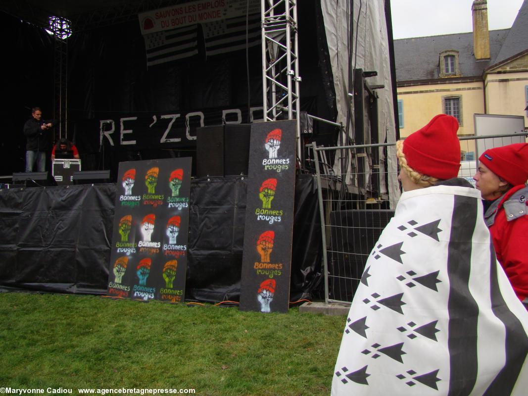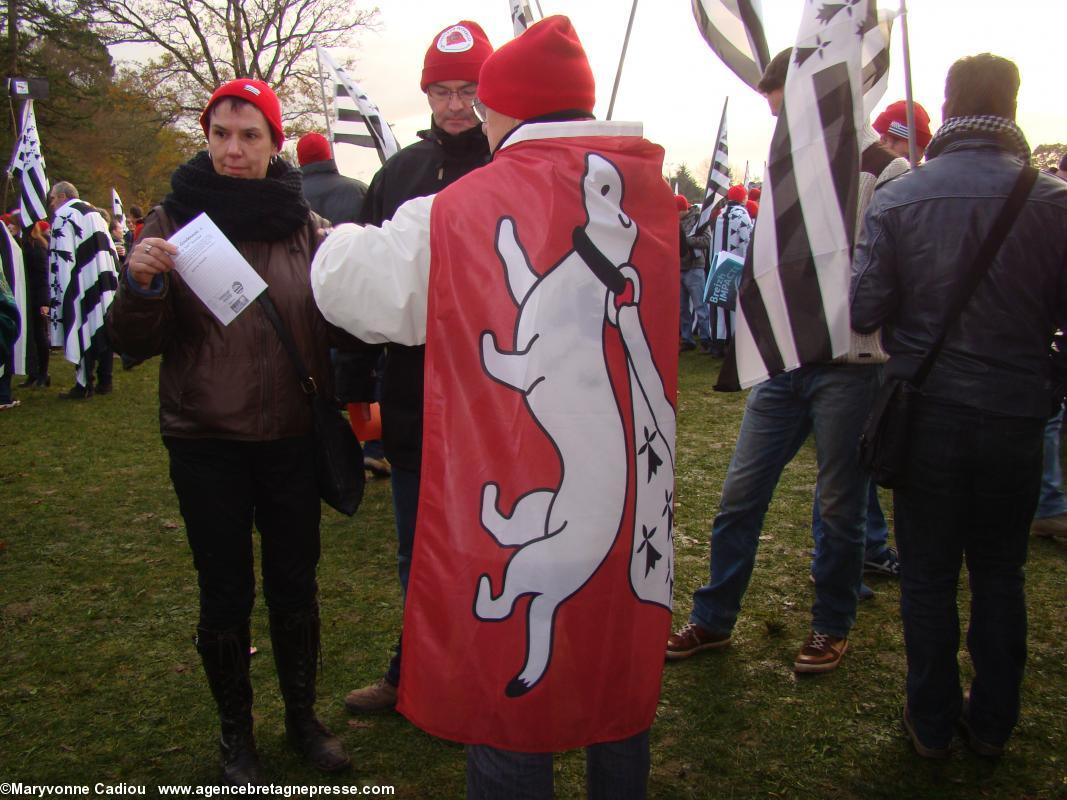 - Au stand de Bretagne Réunie on trouve des gwenn ha du avec hampe pour 5 euros. Et on peut prendre une pancarte pour le défilé imminent. Bonnets Rouges, Karaez 30 nov. 2013.