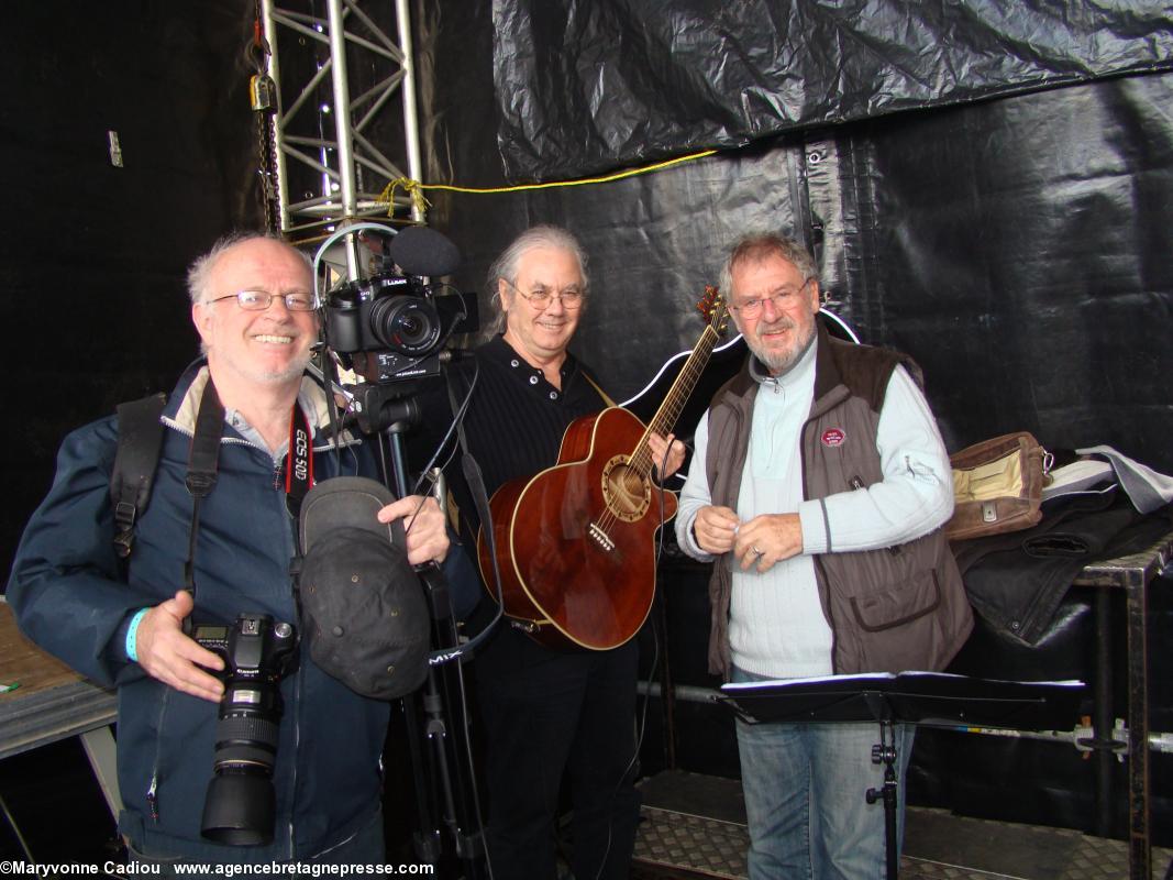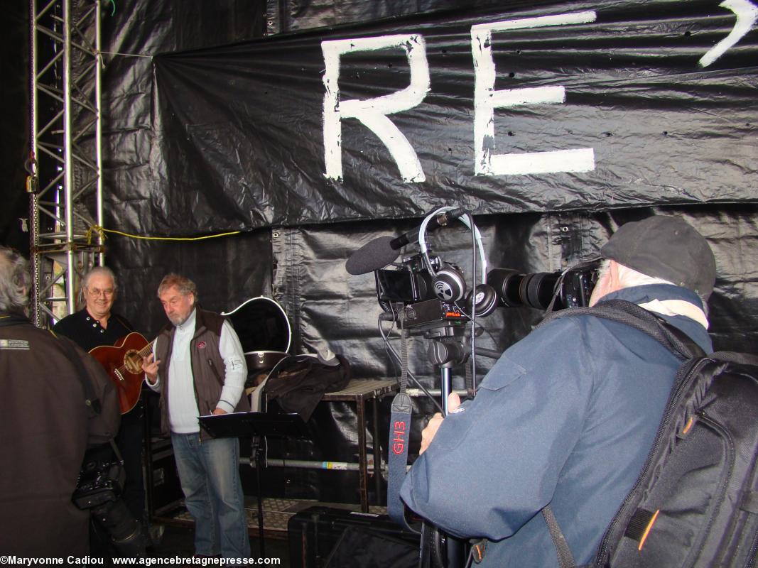 - En coulisse = dans le fond de la scène, Gilles Servat et son guitariste Patrick Audouin. Bonnets Rouges, Karaez 30 nov. 2013.