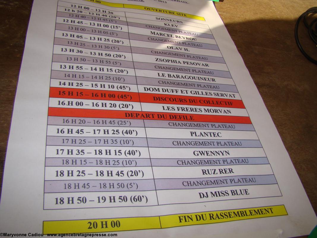 - Le planning - musique et discours - de midi à 20 h. Bonnets Rouges, Karaez 30 nov. 2013.