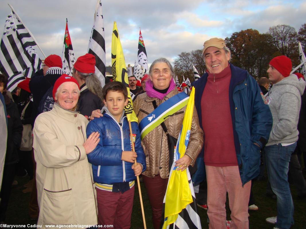 - Mona Bras, élue UDB au conseil de la Région administrative, son petit-fils, le grand druide de Bretagne Per-Vari Kerloc'h et sa femme (à g.). Bonnets Rouges, Karaez 30 nov. 2013.