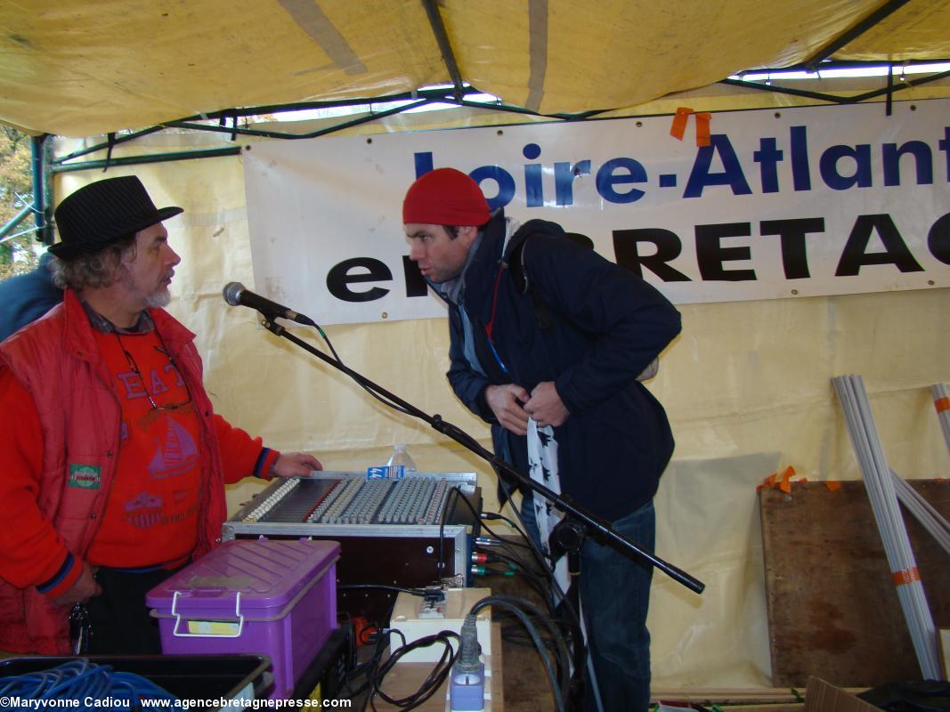 - Pierre Glotin (comité local Sillon de Bretagne, en 44) sonorisait les stands d'associations. Ici avec Thierry Jolivet (comité local Vannes). Bonnets Rouges, Karaez 30 nov. 2013.