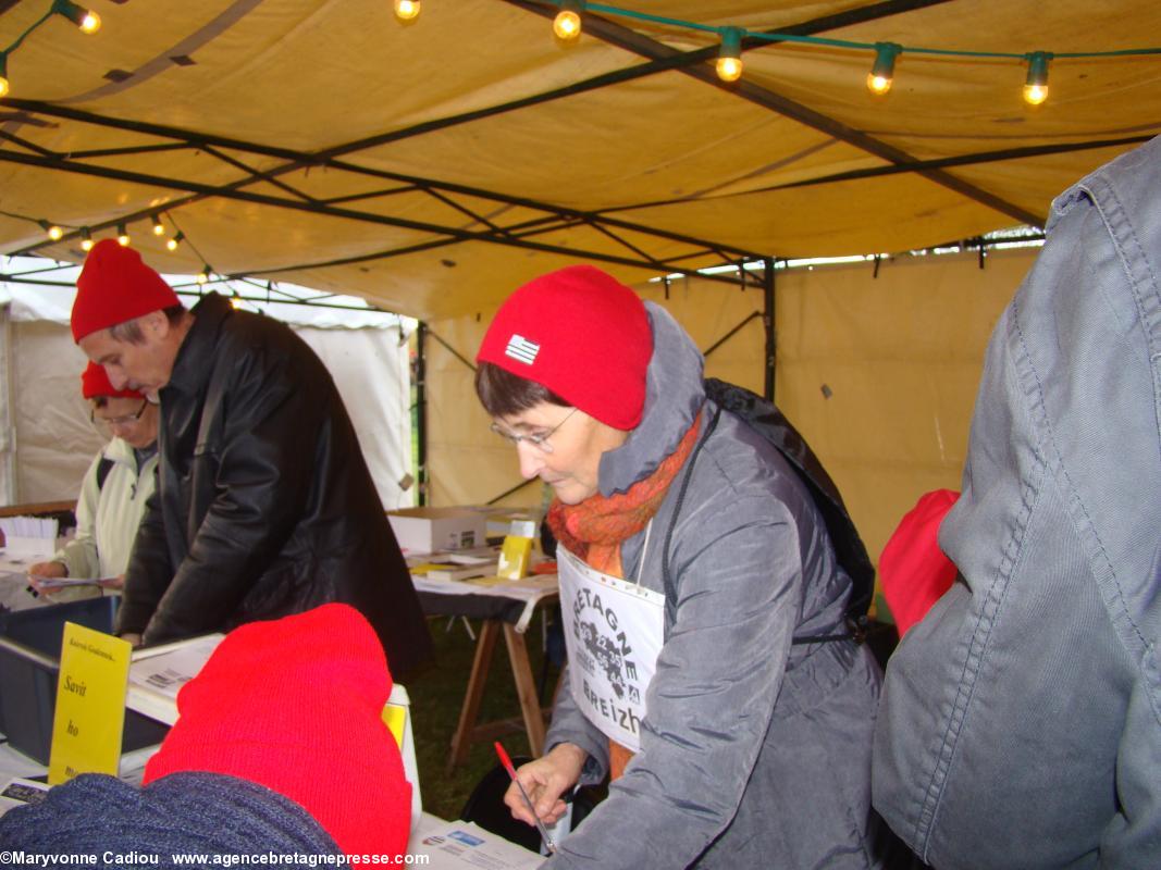 - Sur le stand tenu par Thierry Jamet (Le Temps éditeur) et Marie-Thérèse Carrer-Gorny, tous deux fondateurs de l'école Diwan de Pornic en 2012, école en sommeil. Bonnets Rouges, Karaez 30 nov. 2013.