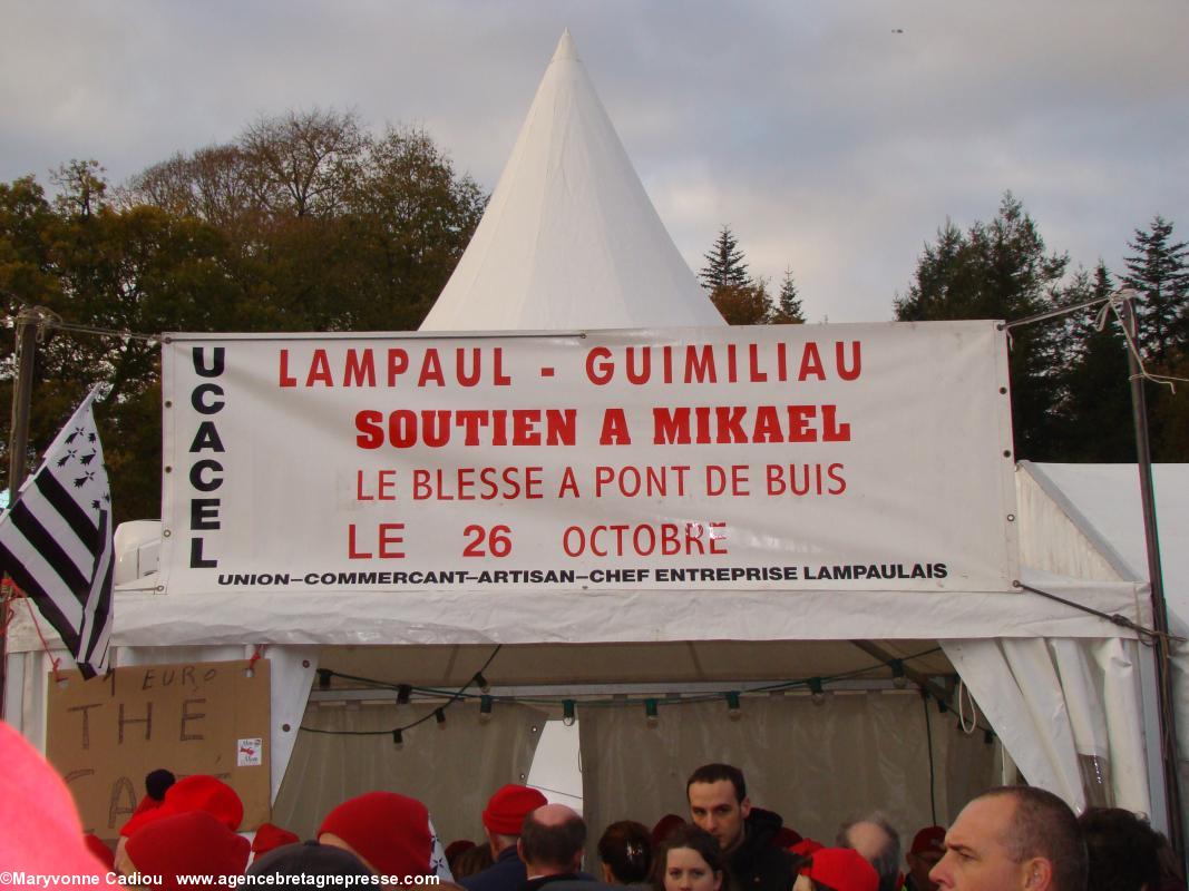 Mickaël Cueff, qui a perdu une main lors de la tentative d'abattre un portique écotaxe à Pont-de-Buis le 18 octobre, monta sur scène et ses amis présentèrent l'association "La main dans la main" qui vise à récolter 40 000 euros pour financer une prothèse intelligente. Plus de 150 camions et autant de gros tracteurs avaient été disposés en bordure de la prairie où avait lieu le rassemblement. Trente mètres d'abris pour la restauration et quinze mètres de stands permettaient de fermer le site.