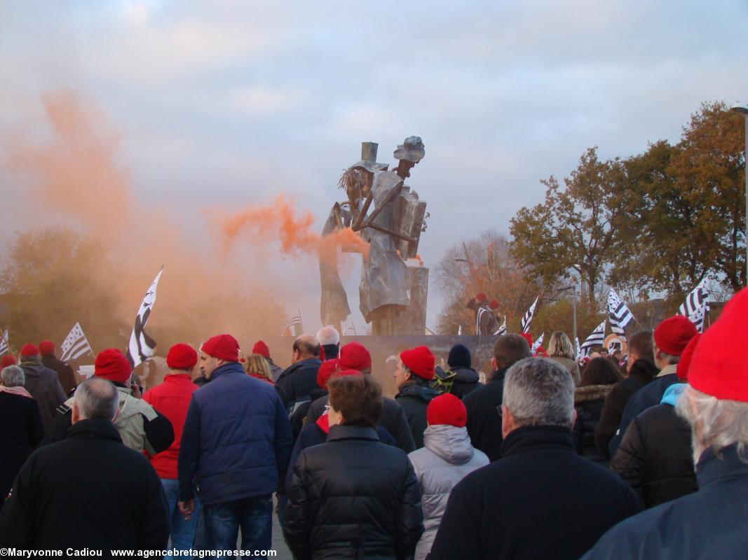 - La sculpture aux Vieilles Charrues, au rond point sur la rocade sud, est en proie aux fumigènes. Bonnets Rouges, Karaez 30 nov. 2013.