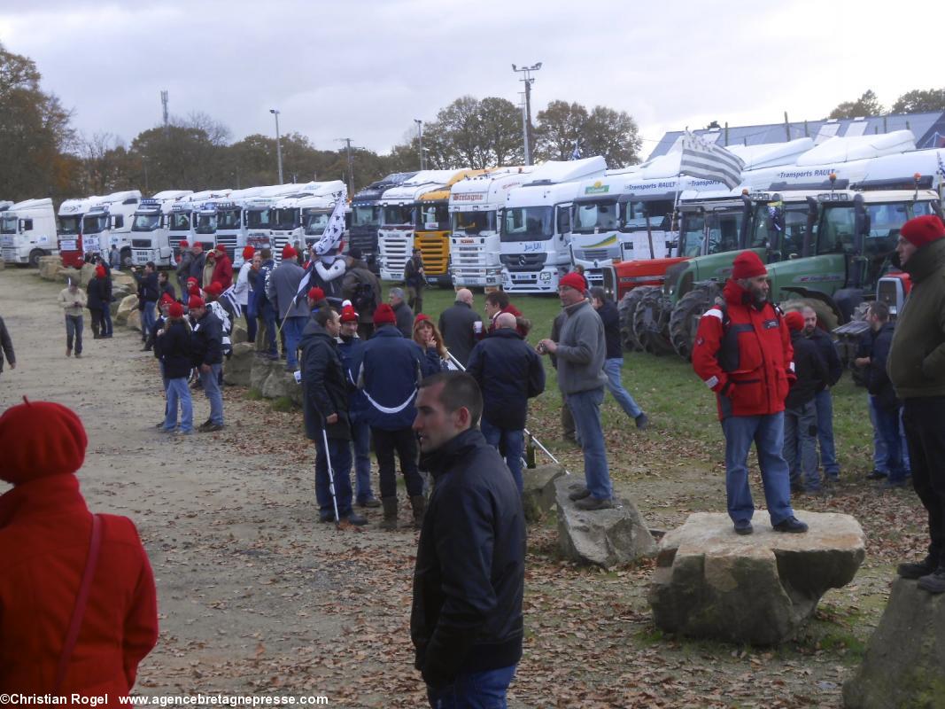 - Le bas de la prairie de Kerampuil, à Carhaix, lors du rassemblement du 30/11/13. Derrière une partie des 150 camions venus pour la manifestation.