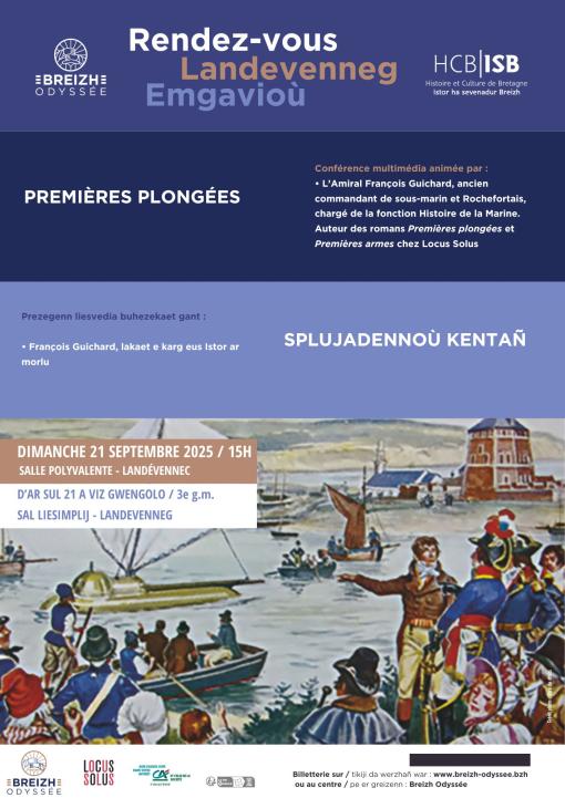 Landévennec, dimanche 21 septembre à 15h salle polyvalente, l'association Histoire et Culture de Bretagne propose, dans le cadre de ses Rendez-vous / Emgavioù Landevenneg, une conférence qui nous immergera dans la grande fresque historique des sous-marins du début du XXe siècle à travers la vie de leurs équipages. François Guichard, ancien commandant de sous-marin et Rochefortais, est désormais amiral chargé de la fonction Histoire de la Marine. Il est l'auteur des livres "Premières plongées" (Prix Ecume de mer 2023 et Prix de la ville de Rochefort 2023) et "Premières Armes" (sortie en octobre 2024) aux éditions Locus Solus. Billetterie: www.breizh-odyssée.bzh (rubrique événements) ou au centre Breizh Odyssée - Participation 5€, gratuit - 12 ans