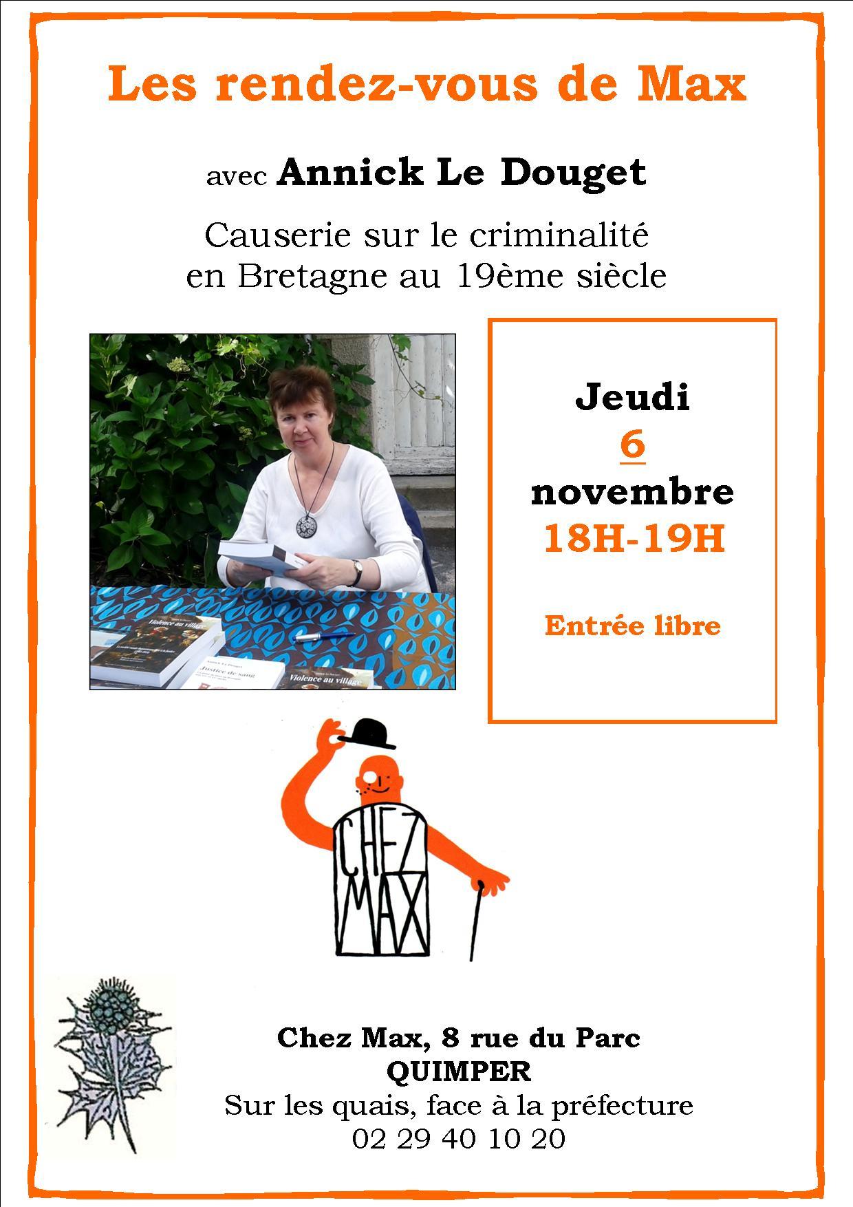 Annick Le Douget est invitée pour une causerie sur les Finistériennes et Bretonnes criminelles, et sur trois figures particulières parmi elles : l'empoisonneuse, la folle et l'ivrognesse mais ce sera aussi l'occasion de parler des hommes !