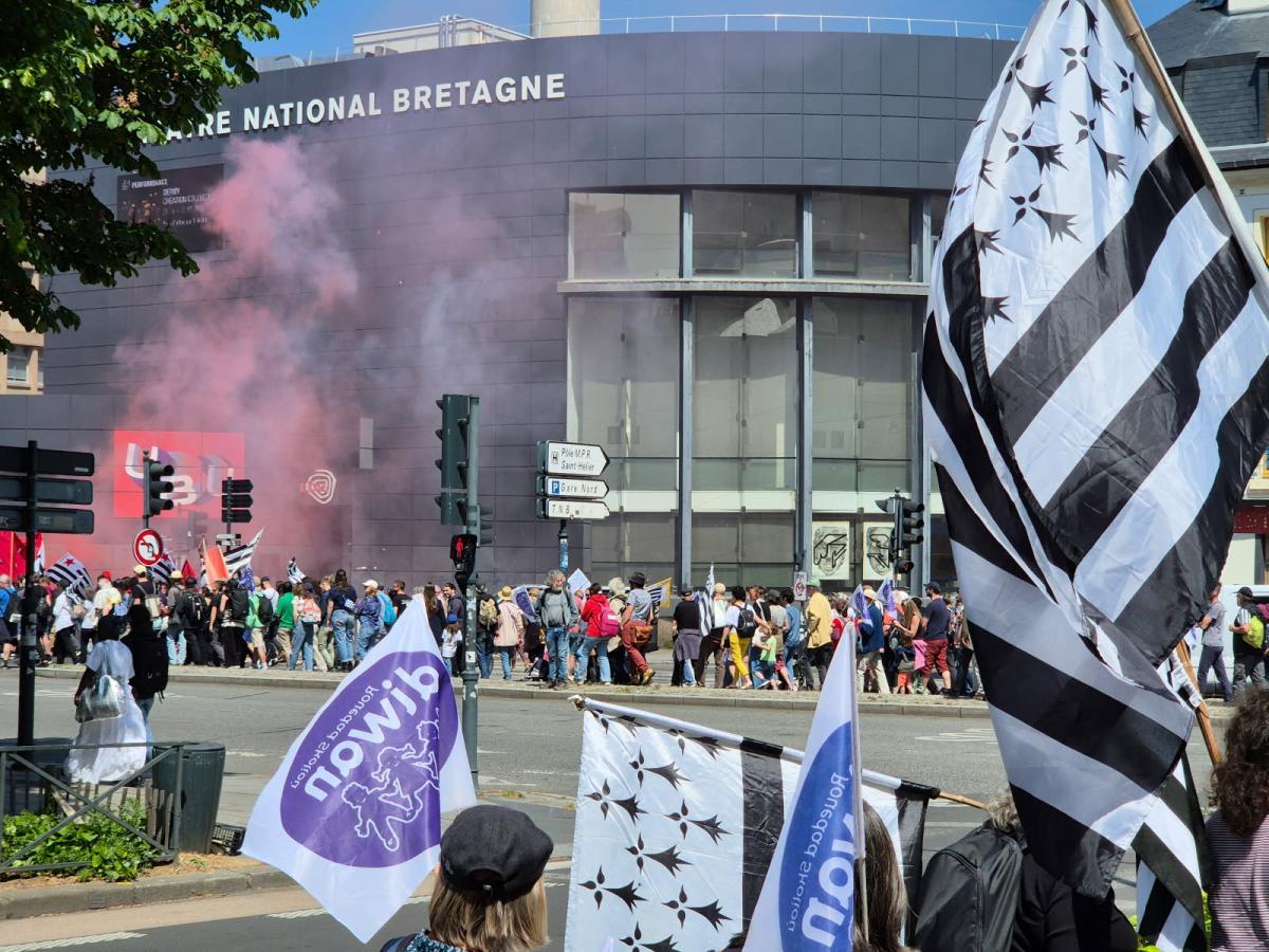 Près de 2000 personnes se sont réunies ce samedi 18 mai à Rennes pour défendre la langue bretonne et soutenir le réseau d’écoles Diwan, en pleine tourmente financière. À l’appel d’une trentaine d’associations, cette mobilisation, à la veille de la Fête de la Bretagne, s’inscrit dans un contexte de baisse générale des moyens alloués à la culture et aux langues régionales.