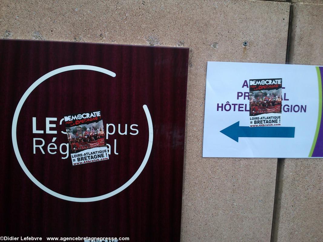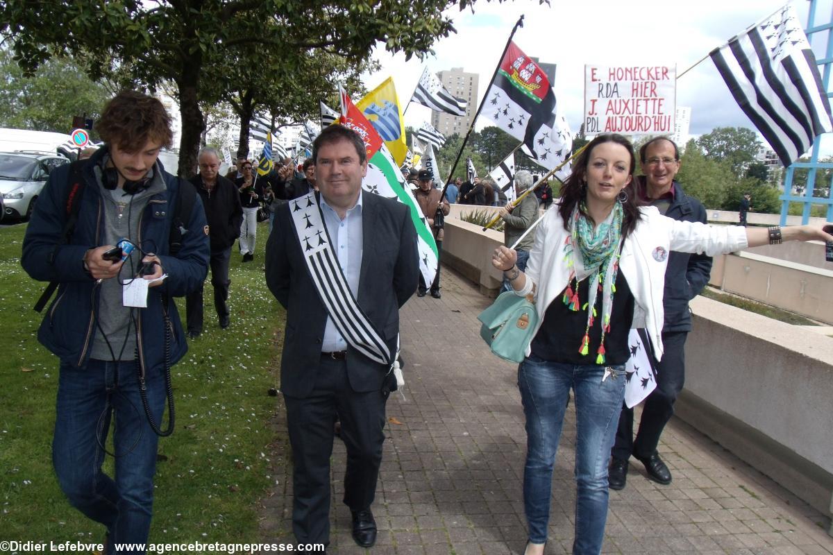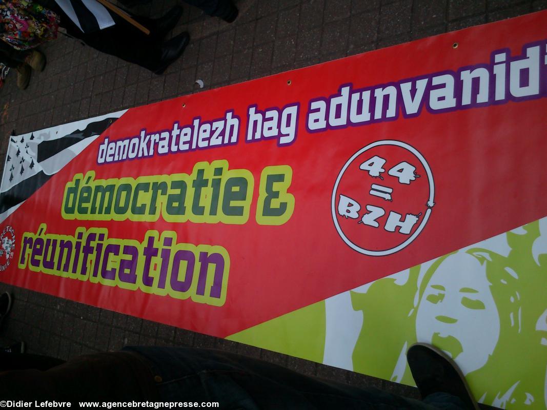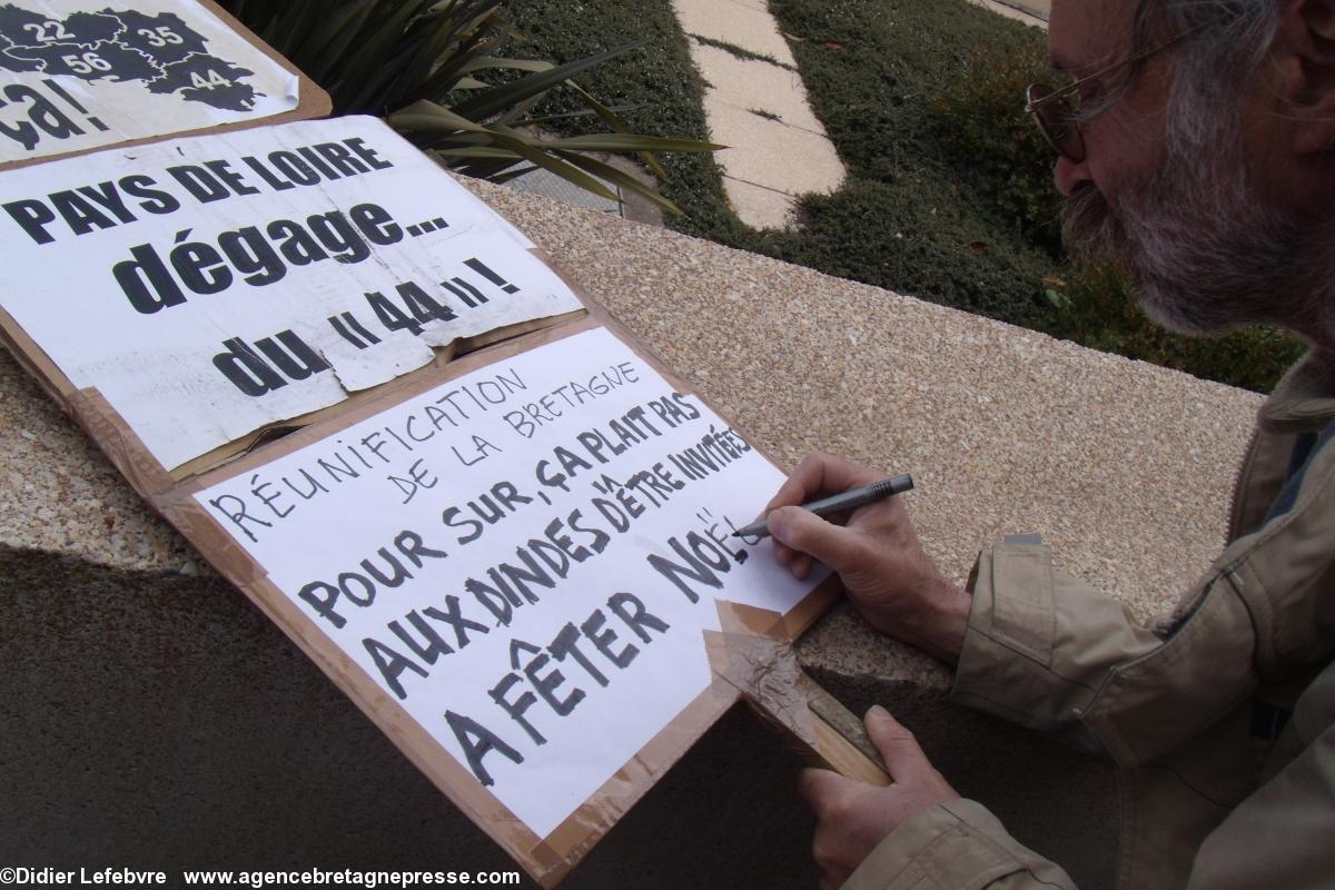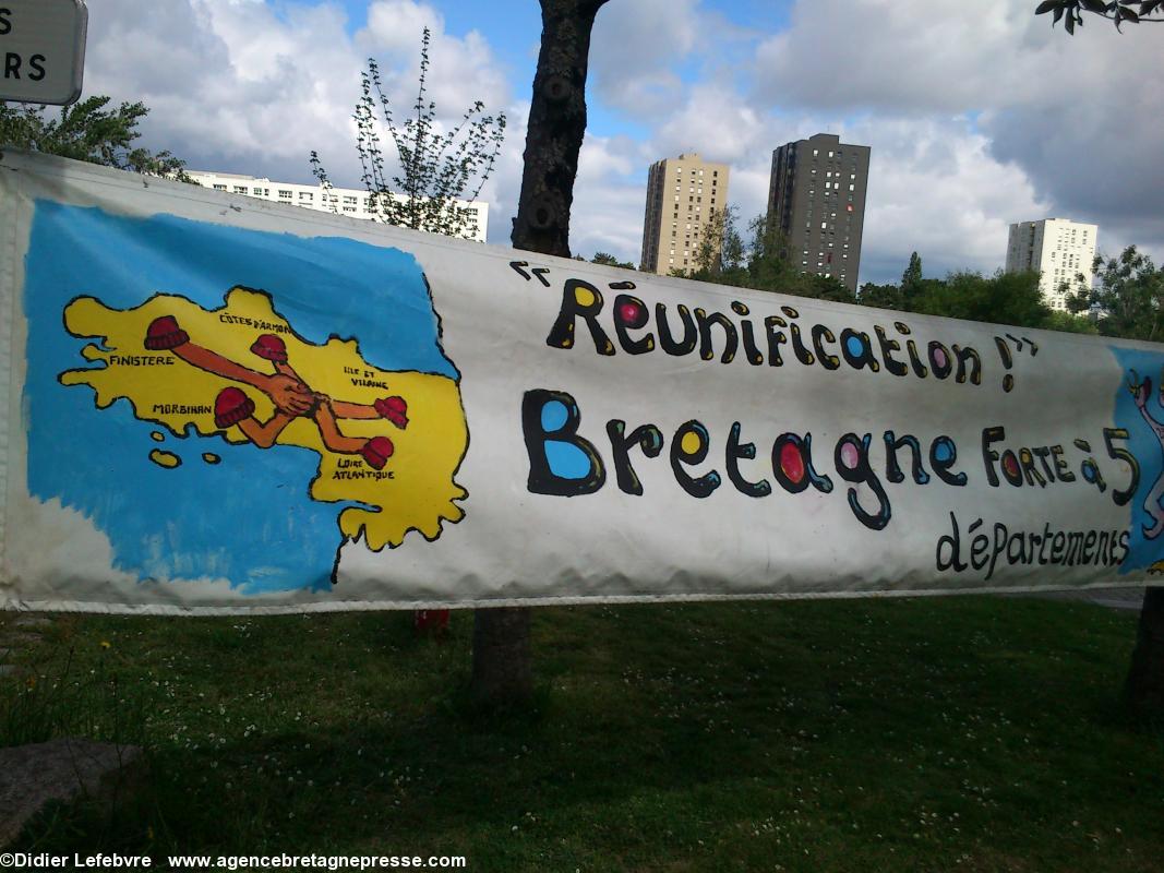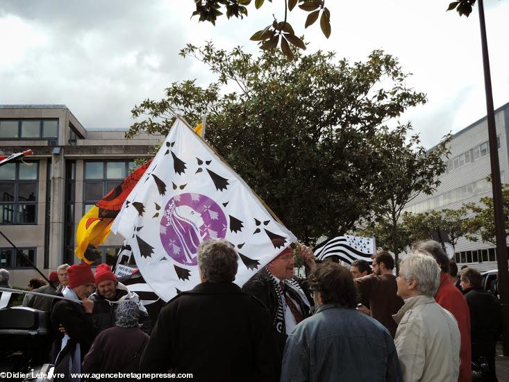 Yann-Fañch Le Bihan conclut le rassemblement, après avoir constaté le refus d'Auxiette de recevoir une délégation de militants : " Nous aurons d'autres moyens de nous faire entendre ". Ça a le mérite d'être clair. Plus de 10.000 manifestants dans les rues de Nantes il y a peu, et le message n'est pas encore entendu. Au contraire, Auxiette joue dans la provocation en faisant voter un v½u à la noix (de la noix de voeu ?) contre la Réunification, mais pour une fusion. Perdu, on est encore là. Et on va savoir se faire entendre. Autrement s'il le faut.On notera en conclusion que la police était en petit nombre, quelques cars, mais très discrète. Même un peu souriante : voir les photos.
