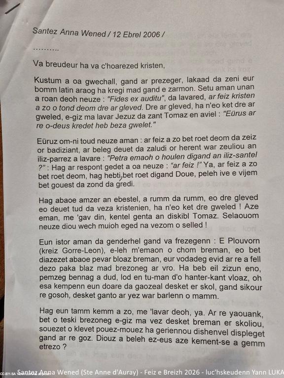 Eurus omp ni tout neuze amañ : ar feiz a zo bet roet deomp da zeiz hor badeziant, ar beleg deuet da saludiñ hor c’herent war seulioù an iliz-parrez a lavare : « Petra emaoc’h o c’houlenn digant an Iliz-Santel ? ». Hag ar respont gedet a oa neuze : « Ar feiz ! ». Ya, ar feiz a zo bet roet deomp, hag hepti, bet roet digant Doue, pelec’h ivez e vijemp bet gouest da zont da grediñ.