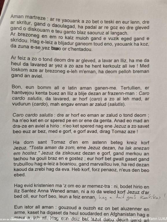 Hag evit kristenien ma 'z omp, eo ar memes tra : ni bodet hiriv en Iliz Santez Anna Wened amañ, ni a ro da welout korf Jezuz d’ar bed holl, ur c’horf bev, leun a feiz ennañ.