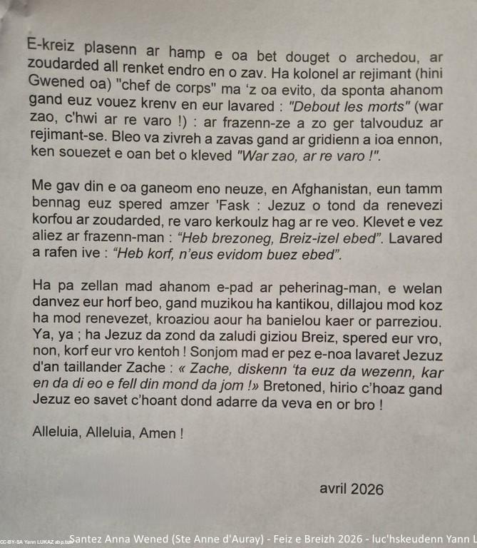 Ha pa sellan mat ac’hanomp e-pad ar pirc’hirinded-mañ, e welan danvez ur c’horf bev, gant muzikoù ha kantikoù, dilhadoù mod-kozh ha mod renevezet, kroazioù aour ha bannieloù kaer hor parrezioù. Ya, ya : Jezuz da zont da saludiñ gizioù Breizh, spered ur vro, nann, korf ur vro kentoc’h ! Sonjomp mat er pezh e-noa lavaret Jezuz d’an tailhanter Zache : « Zache, diskenn ‘ta eus da werenn, kar en da di eo e fell din mont da chom ! ». Bretoned, hiriv c’hoazh gant Jezuz eo savet c’hoant dont adarre da vevañ en hor bro !