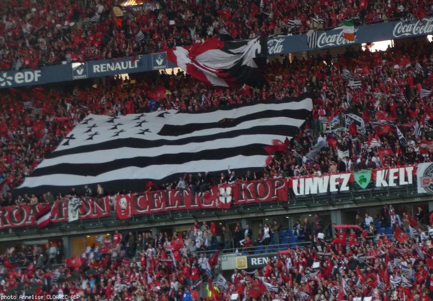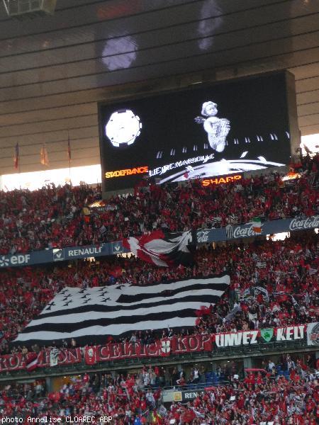 Une ambiance du tonnerre pour cette finale de la coupe de France de Football entre deux clubs bretons. Vingt mille gwenn ha du flottaient dans le vent et 80 000 bretons venus de Guingamp, de Rennes et de l'Ile de France. La SNCF avait apprêté 8 TGV spéciaux. Pas moins d'une centaine de cars juste pour les supporters de Guingamp et bien plus pour Rennes avaient convergé vers Saint-Denis. Pour la première fois dans l'histoire du foot (*): un évènement de portée historique, l'hymne national breton, le bro goz ma zadoù, a été joué et acclamé par une foule en liesse. Ce samedi soir à Saint-Denis, ce fut la fête de la nation bretonne.
