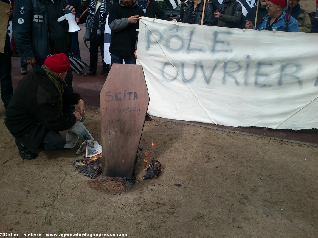 - Manifestation du 1er mai des Bonnets rouges à Saint-Nazaire. Un cercueil qui peine à brûler.