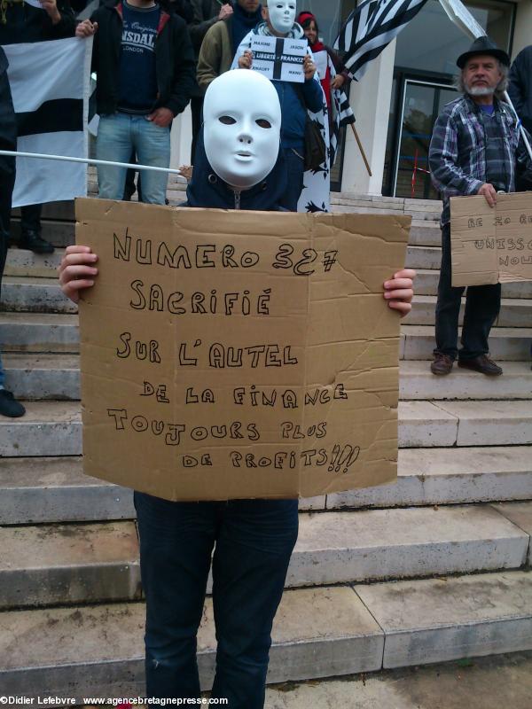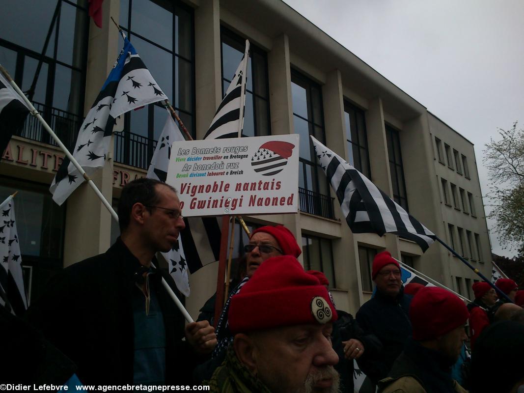 L'orateur précise que la devise des Bonnets rouges a toute sa signification ici : vivre, décider et travailler en Bretagne. Il est nécessaire de relocaliser les centres de décision, et de cesser de délocaliser l'emploi. Denez, un manifestant, ajoute que la Seita, (plus précisément Impérial Tobacco NDLR) fait des bénéfices et distribue des dividendes de plusieurs centaines de millions d'Euro, mais veut délocaliser l'usine de Kerc'hfaou (le nom breton de Carquefou, NDLR) en Pologne.