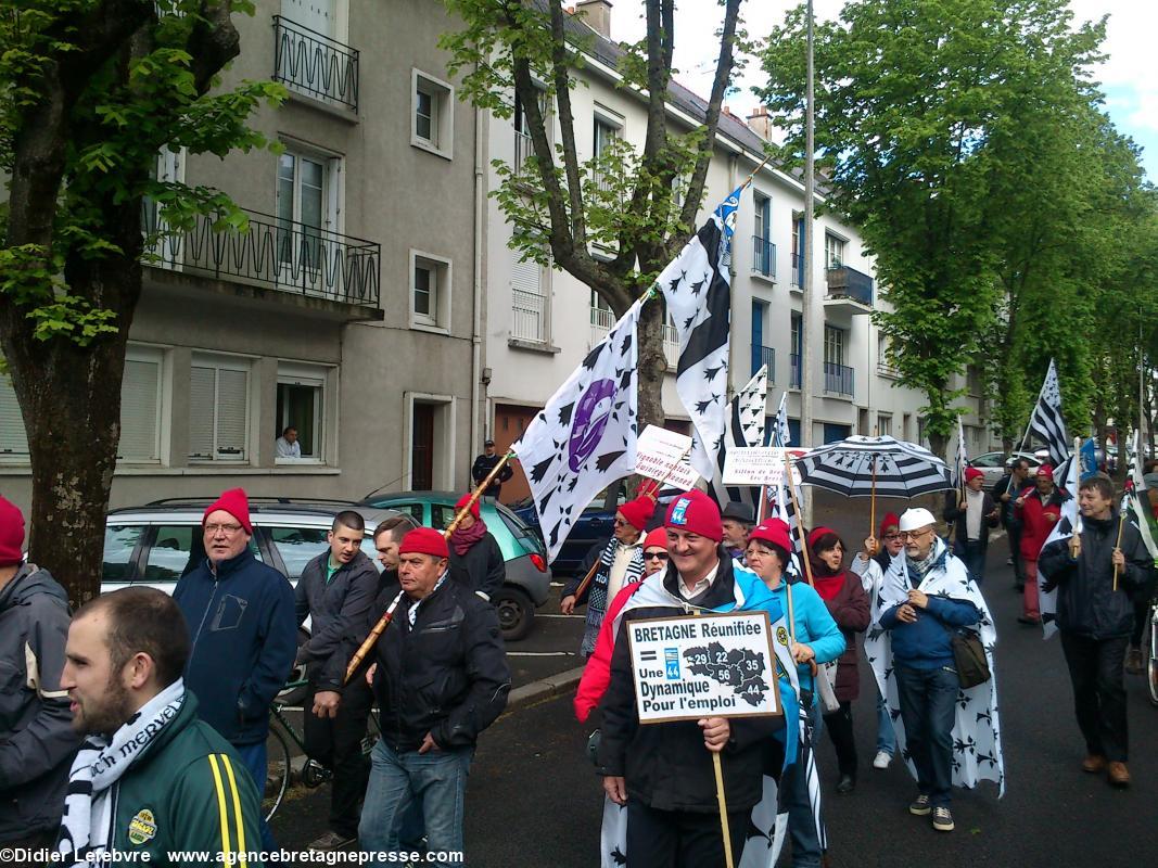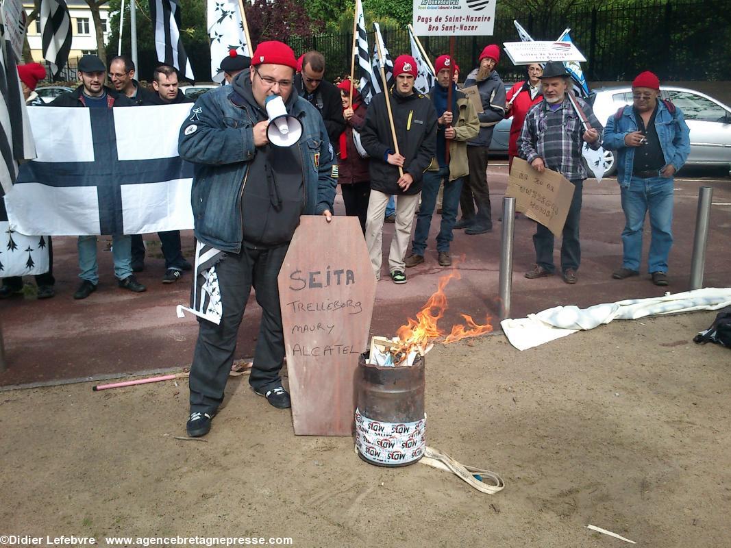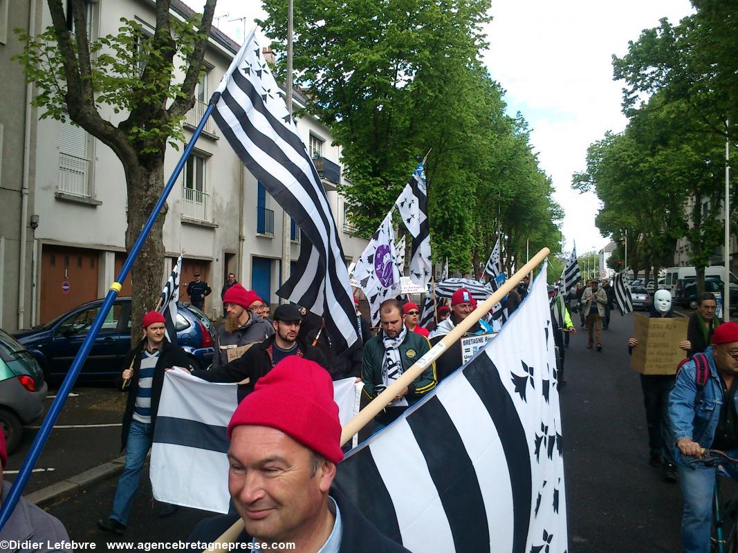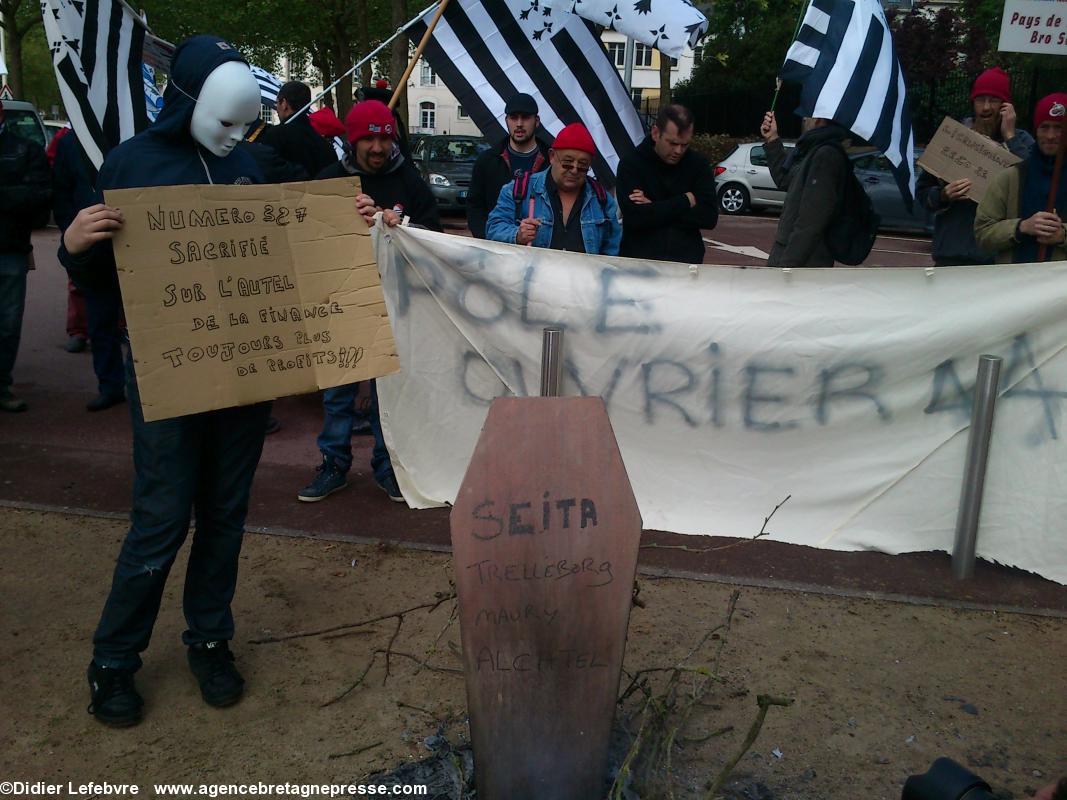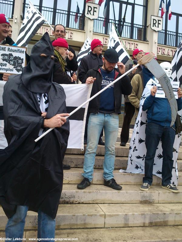 Bon enfant, le cortège s'est dirigé calmement vers la sous-préfecture au son d'une bombarde, et au cri de « Bevet Breizh » (« vive la Bretagne »). Outre les Gwenn-ha-du, on y voit... la Duchesse Anne, dont on célèbre cette année le 500e anniversaire de sa disparition http://annedebretagne2014.wordpress.com/.Les organisateurs avait imaginé y brûler un cercueil, symbolisant la disparition de l'emploi en Loire-Atlantique. Est-ce un bon signe ? Faute de branchettes sèches en quantité suffisante, et d'un bois beaucoup trop dense, le cercueil refusait de brûler.