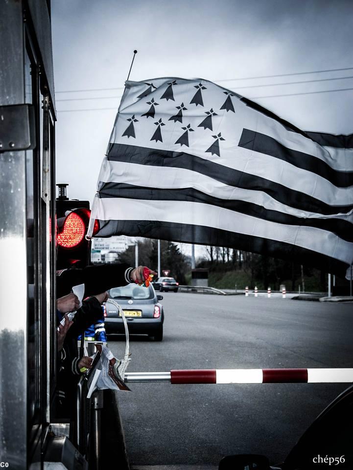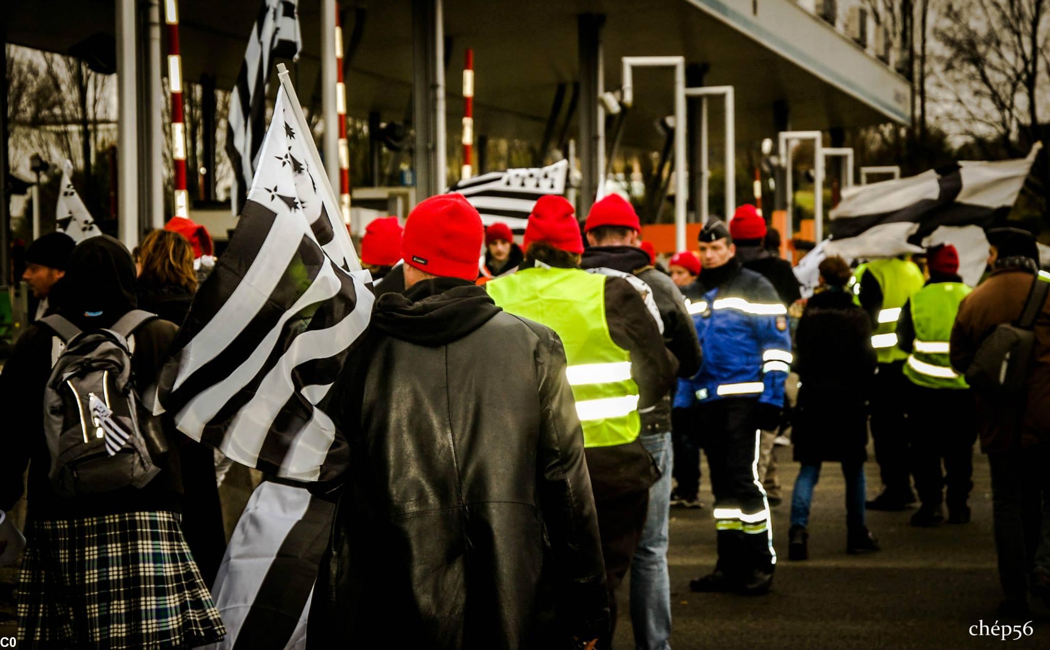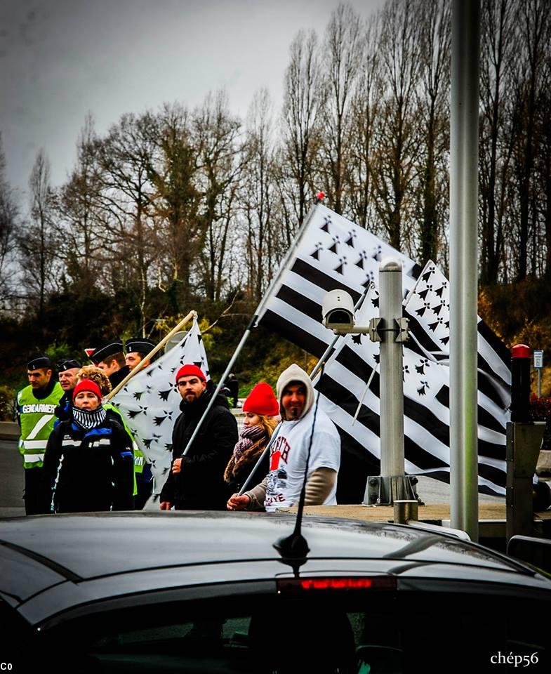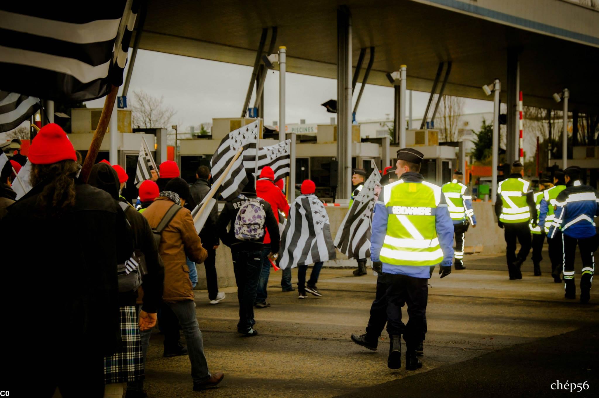 Rencontre fut aussi faite au lieu de rendez-vous avec les forces de l'ordre, qui ont ouvert la route aux Bonnets Rouges jusqu'au péage pour que ces derniers puissent passer en toute quiétude, et les ont accompagnés tout au long de cette journée de manière fort sympathique, avec des échanges cordiaux entre les deux côtés.