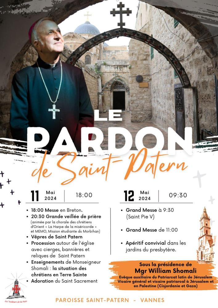 Une très bonne nouvelle concernant la programmation du Pardon de Saint-Patern 2024 à Vannes, qui propose cette année une messe en breton pour débuter les festivités. Ça se passera les 11 et 12 mai prochains. Le tout avec un programme très riche que vous pouvez découvrir ci-dessous, sous la présidence de Mgr William Shomali, évêque auxiliaire du Patriarcat de Jérusalem, également vicaire général et patriarcal de Jérusalem et Palestine.