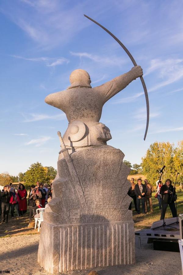 Cette sculpture monumentale représente un archer anglais de 1488, en hommage aux 440 archers anglais environ, venus de l’île de Wight sous commandement de Sir Edward Woodville « Lord Scales », et morts ici pour défendre la souveraineté et l’indépendance de la Bretagne, le 28 juillet 1488, voici 530 ans.
