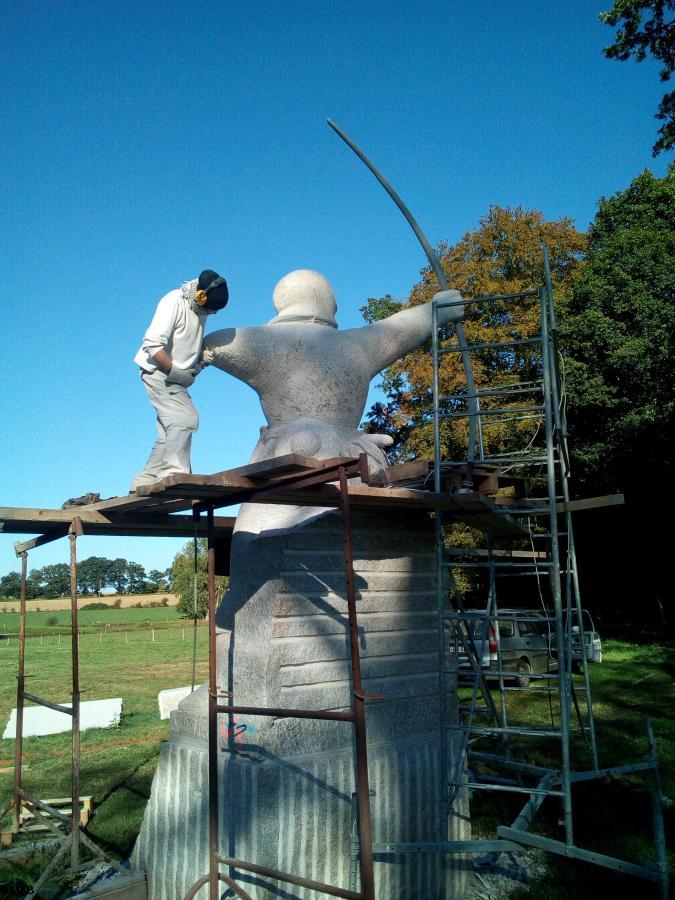 Les propriétaires du château de la Giraudais, Jérôme et Laurence Jacquet, ont fait cette commande à Marc Simon, voici prés de 18 mois… Ensuite, il aura fallu au sculpteur Marc Simon, ( à qui on doit déjà et entre autres sculptures le portrait d’Anne de Bretagne sur le terrain MAB Koad Sav Pell ), 14 mois de travail, deux études, six maquettes et près de 700 heures de taille. Sur son socle, l’archer anglais de pierre mesure 3m, et l’arc lui même en granit, (prouesse technique exceptionnelle), décrit une portion de cercle de 3,40 m.